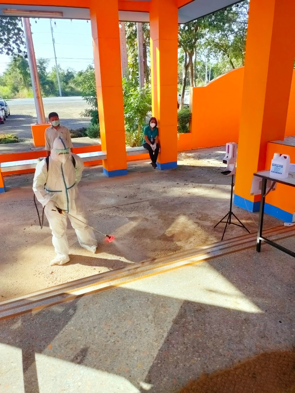 ดำเนินการฉีดพ่นน้ำยาฆ่าเชื้อโควิด-19 บริเวณภายในและภายนอกสำนักงาน อบต.อุดมทรัพย์